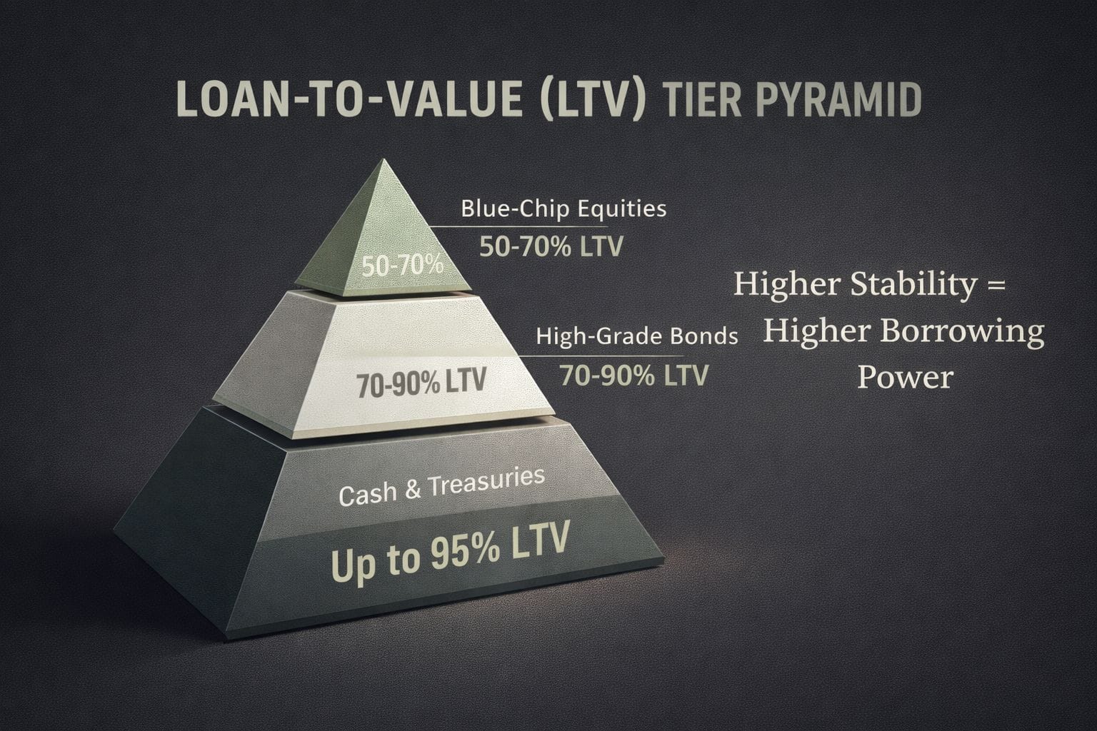 Different asset classes provide varying levels of liquidity. This chart illustrates how safer, lower-volatility assets yield significantly higher borrowing power (Loan-to-Value) compared to speculative assets.